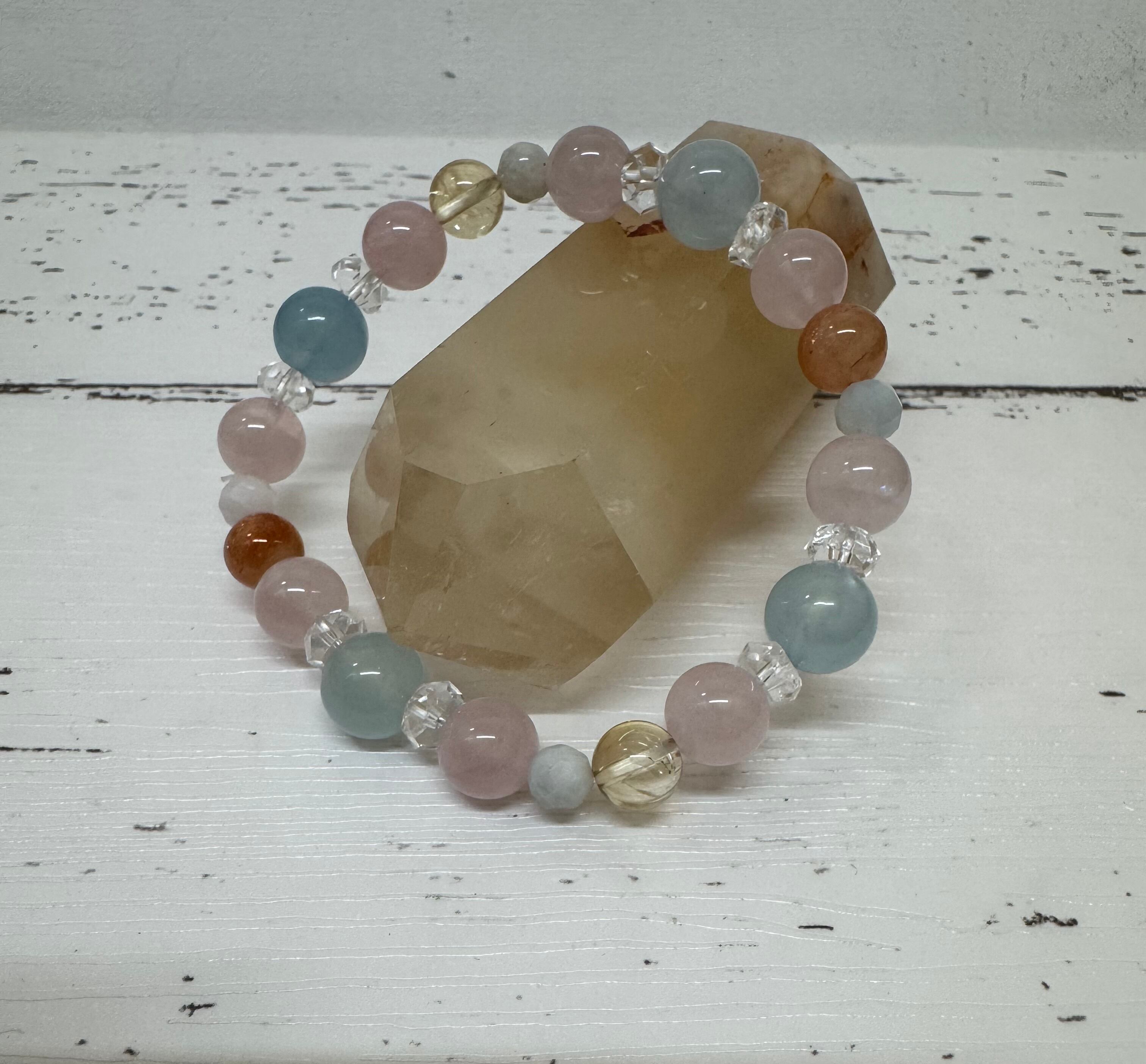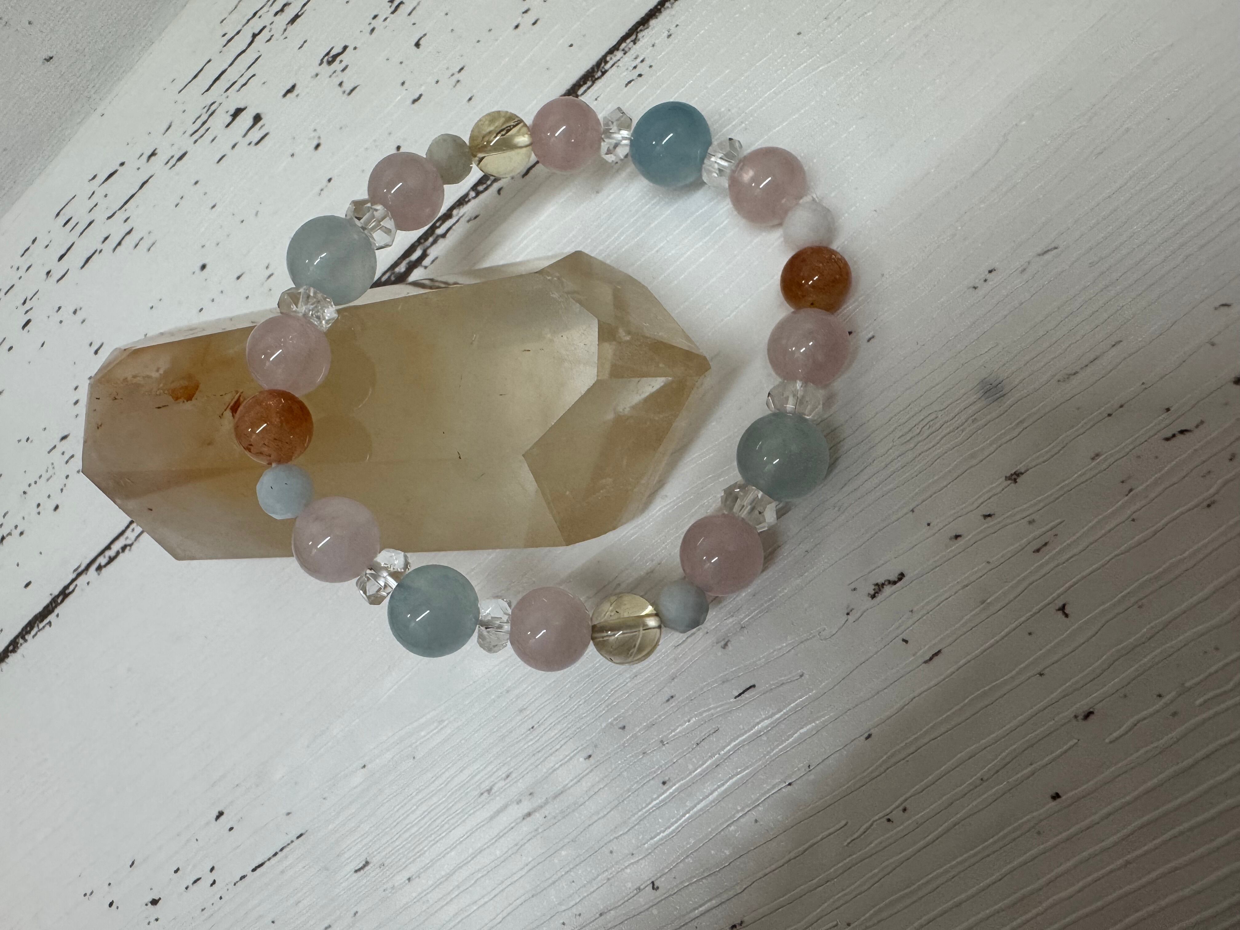このローズブレスレットは、愛情や夢を叶えるためにデザインされた特別なアイテムです。ローズクォーツの柔らかなピンク色は、恋愛運を高めると言われ、クリスタルがその力をさらに引き立てます。アメジストとカーネリアンが加わることで、心の安定を促し、ポジティブなエネルギーをもたらします。