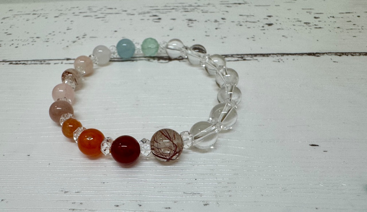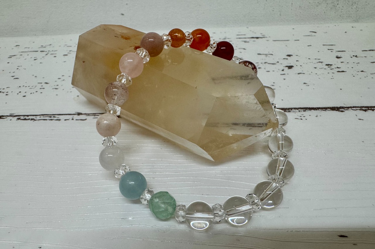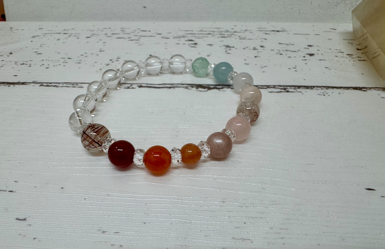 この夏レインボーブレスレットは、あなたの運気を引き上げるためにデザインされた特別なアイテムです。オーラ色のクリスタルが夏の光を反射し、心を明るくするエネルギーを放ちます。また、虹色の天然石が馴染みやすく、さまざまなスタイルに合わせてお楽しみいただけます。カラフルなビーズは、毎日の気分を高め、楽しいひとときを演出してくれるでしょう。