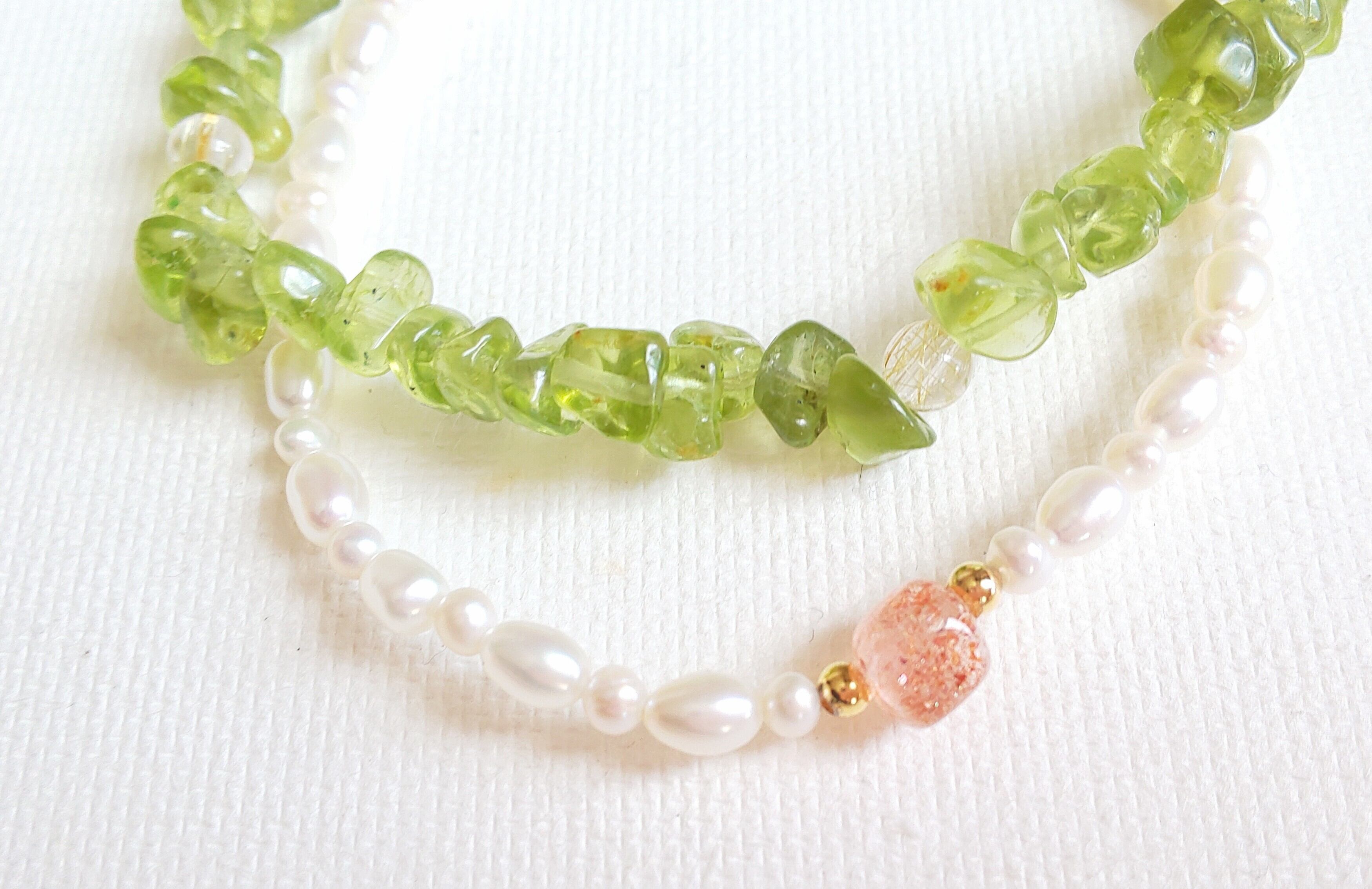ペリドットのさざれ+サンストーンの淡水パールブレスレット