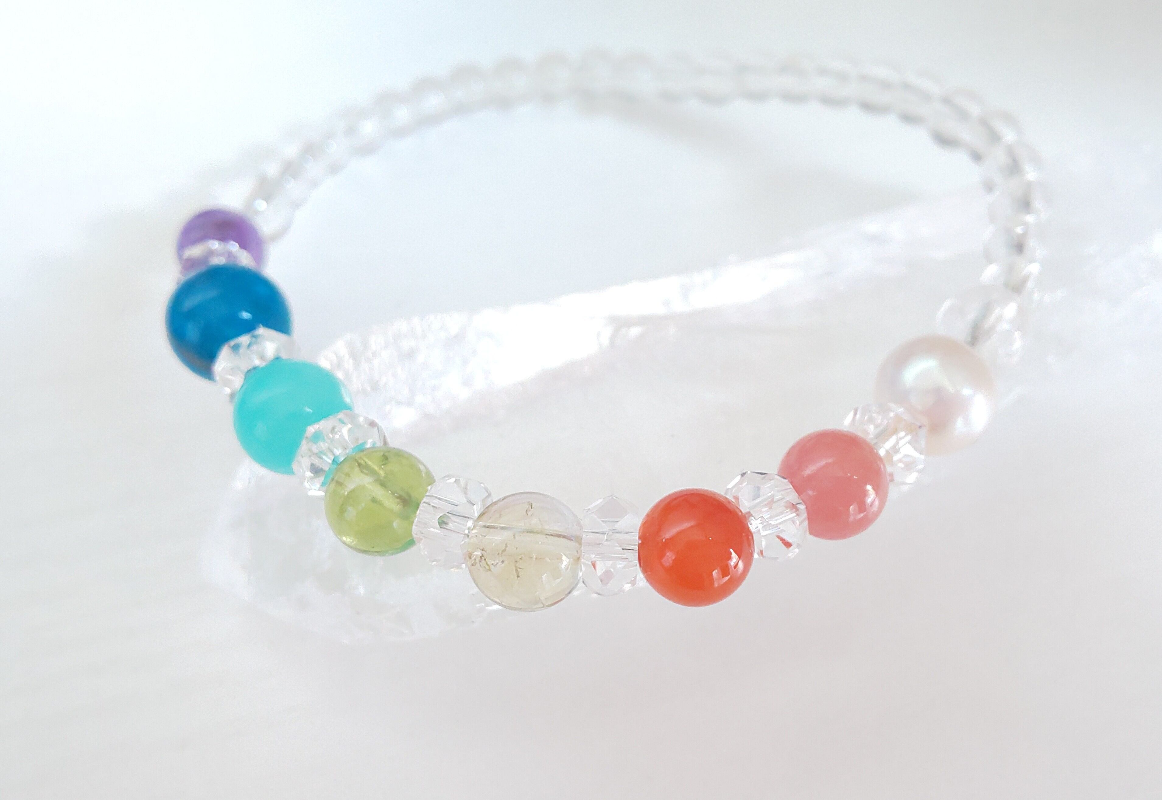 細身4ミリの水晶に、7色の天然石+淡水パールを配置し、シンプルで使いやすく仕上げました♪