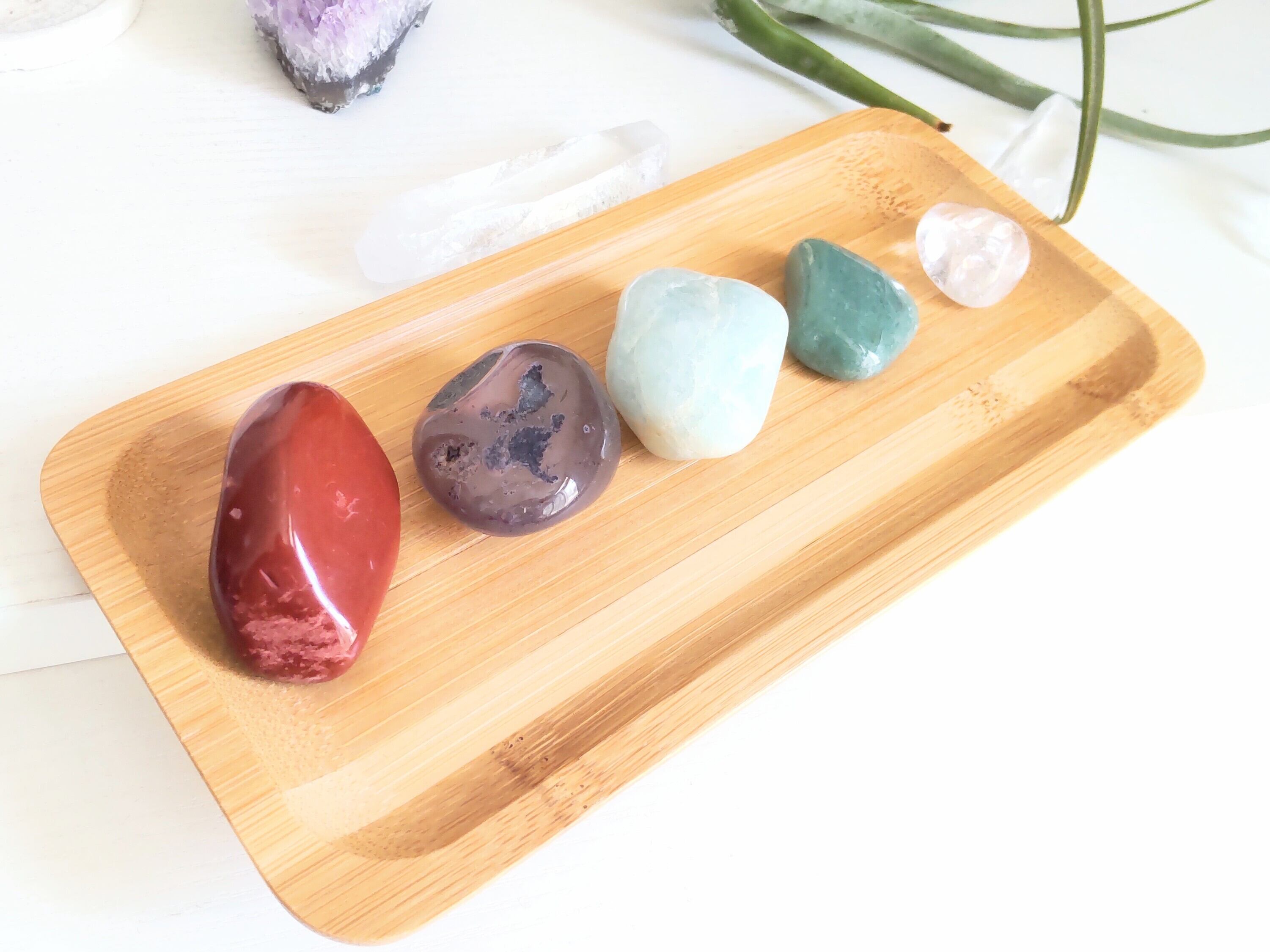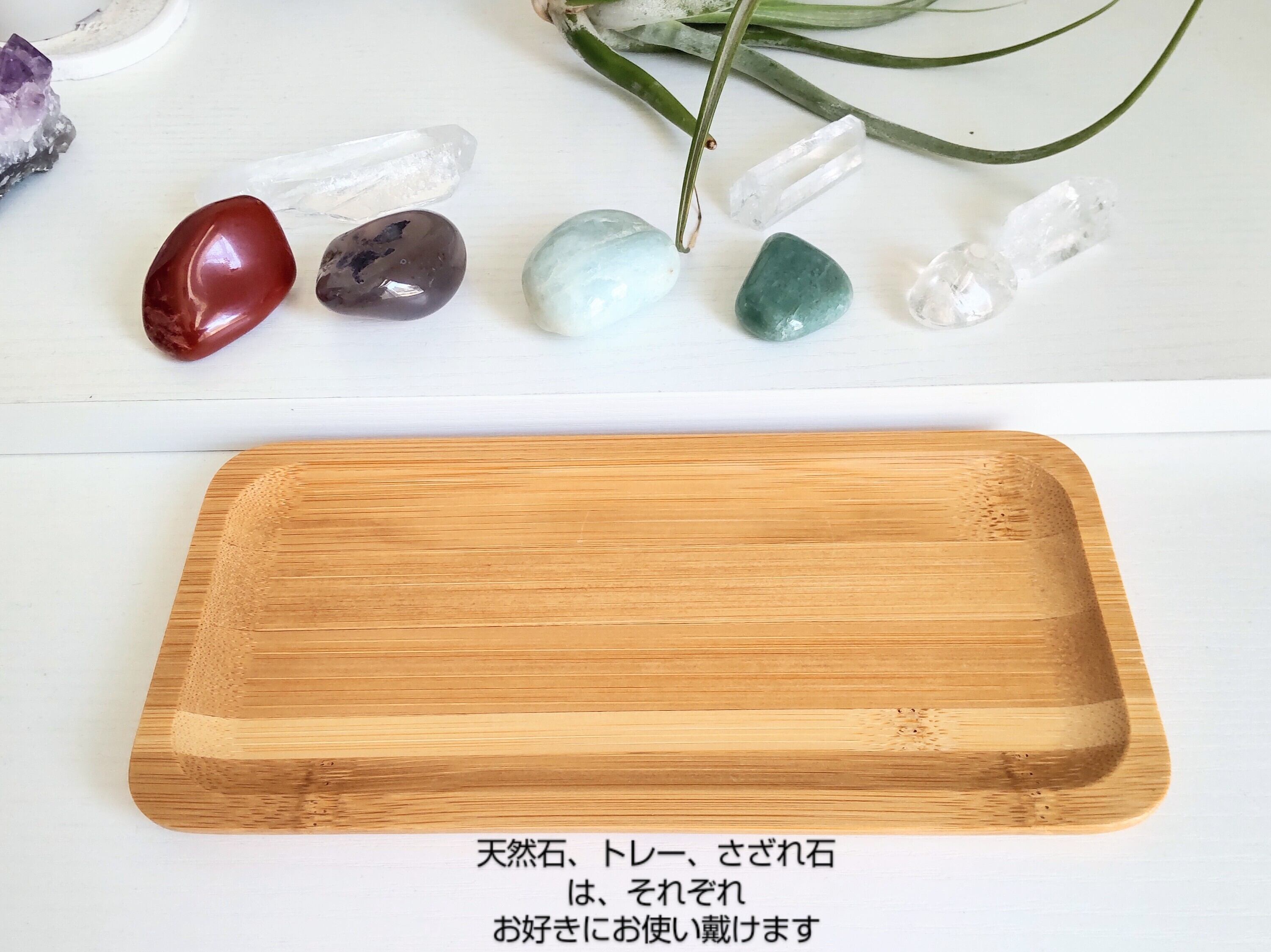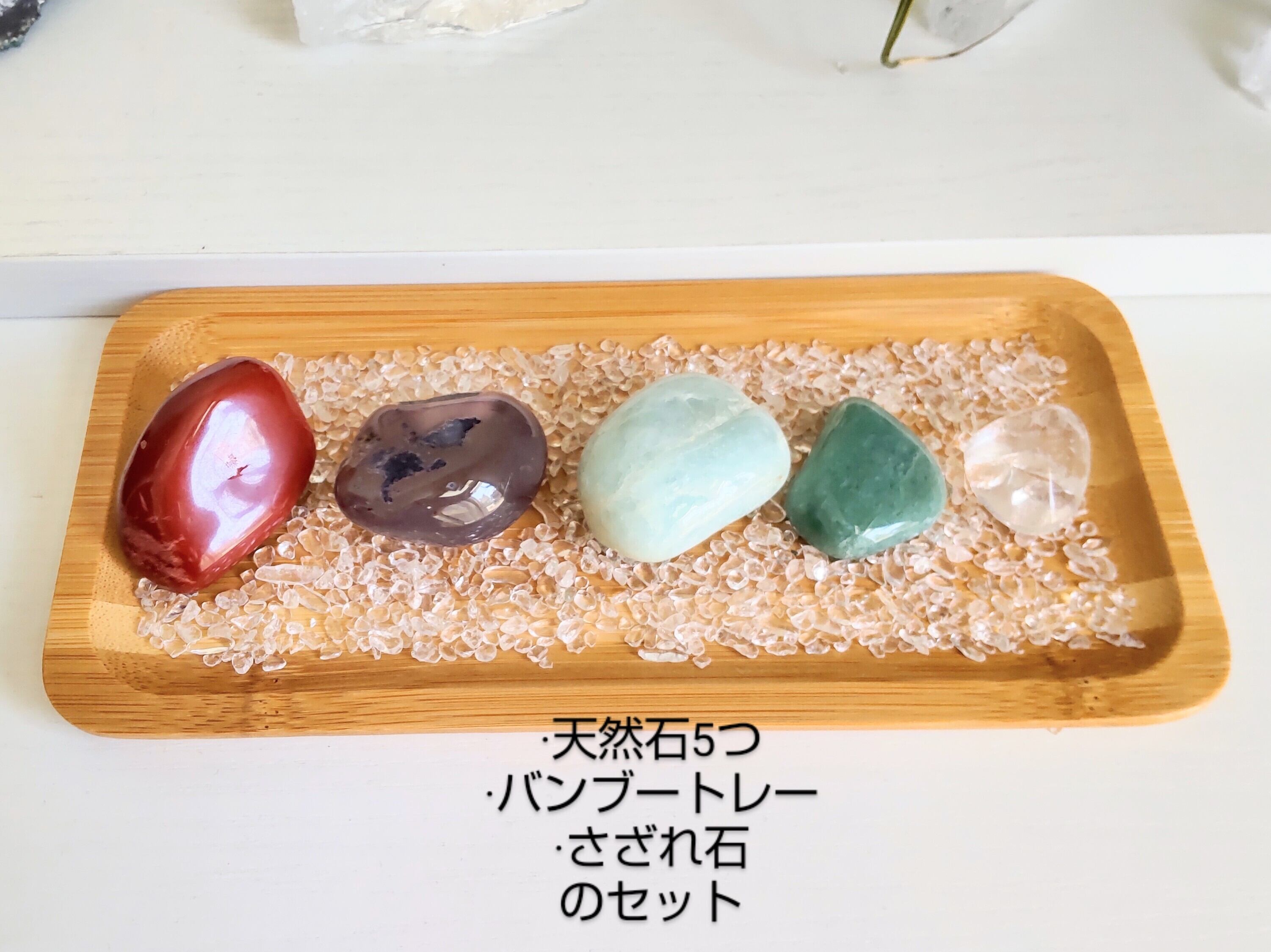 健康·幸運·癒し·安定·運気アップの5つの天然石と、浄化用さざれ、バンブートレーのセットです♪