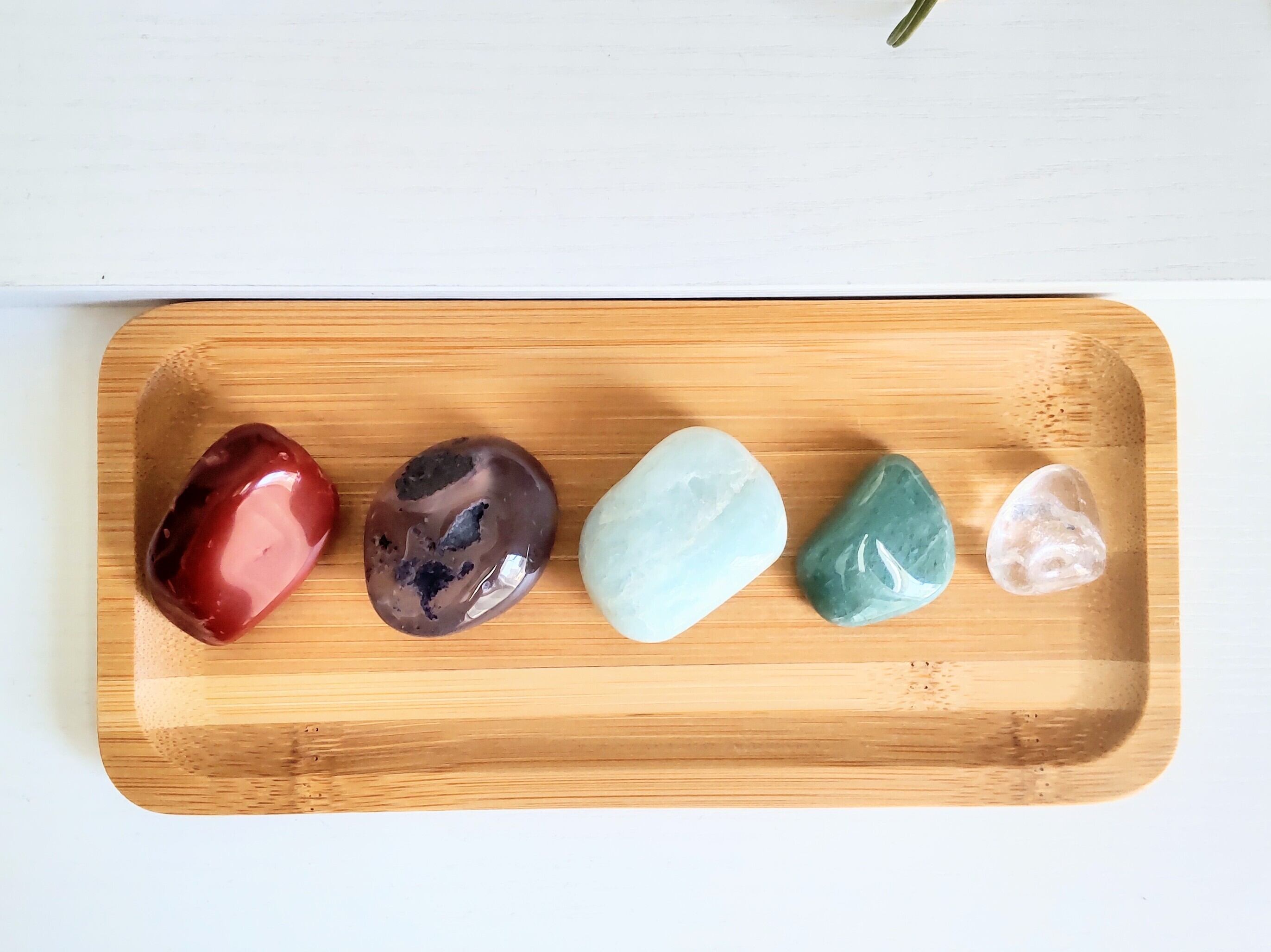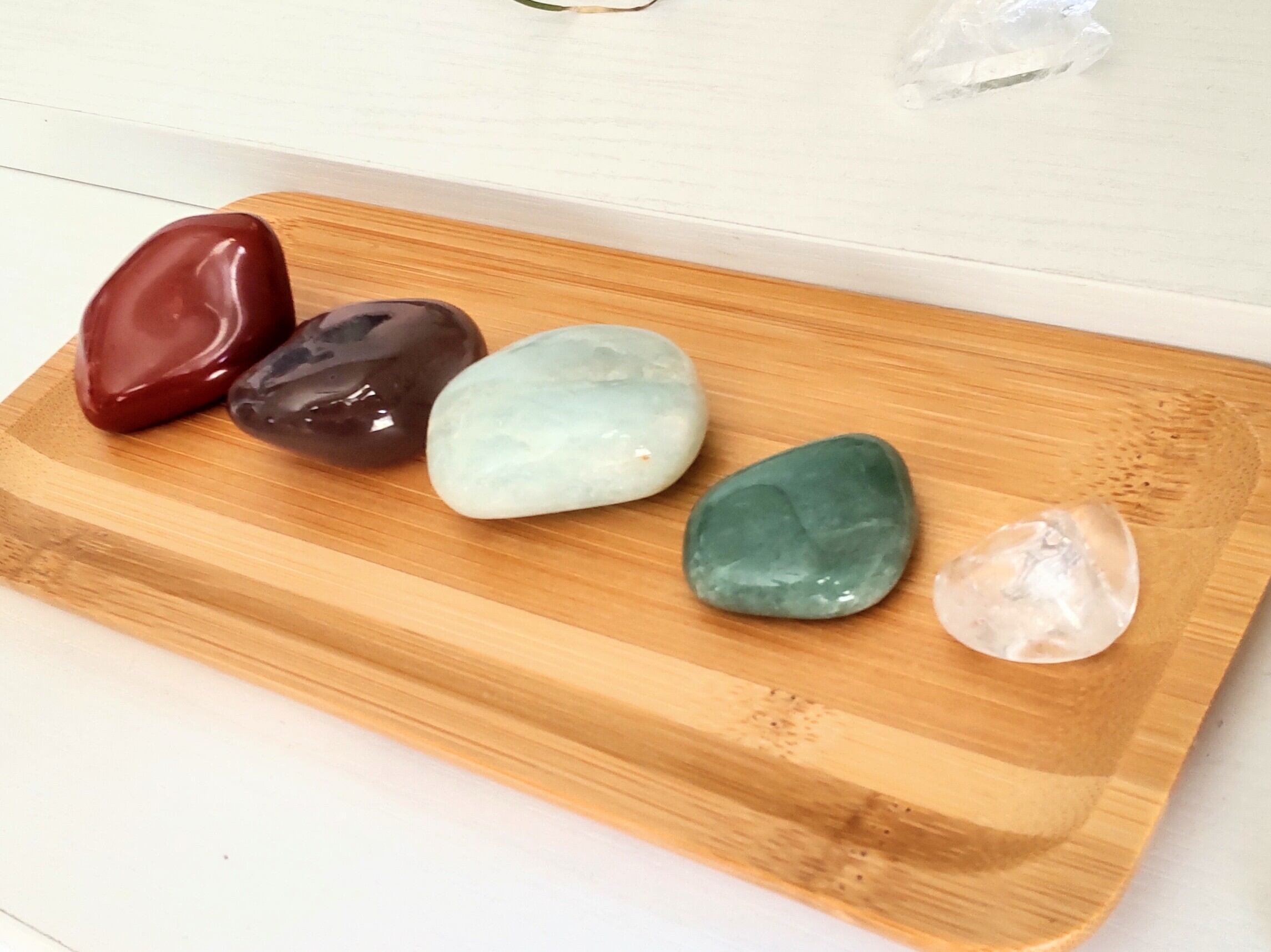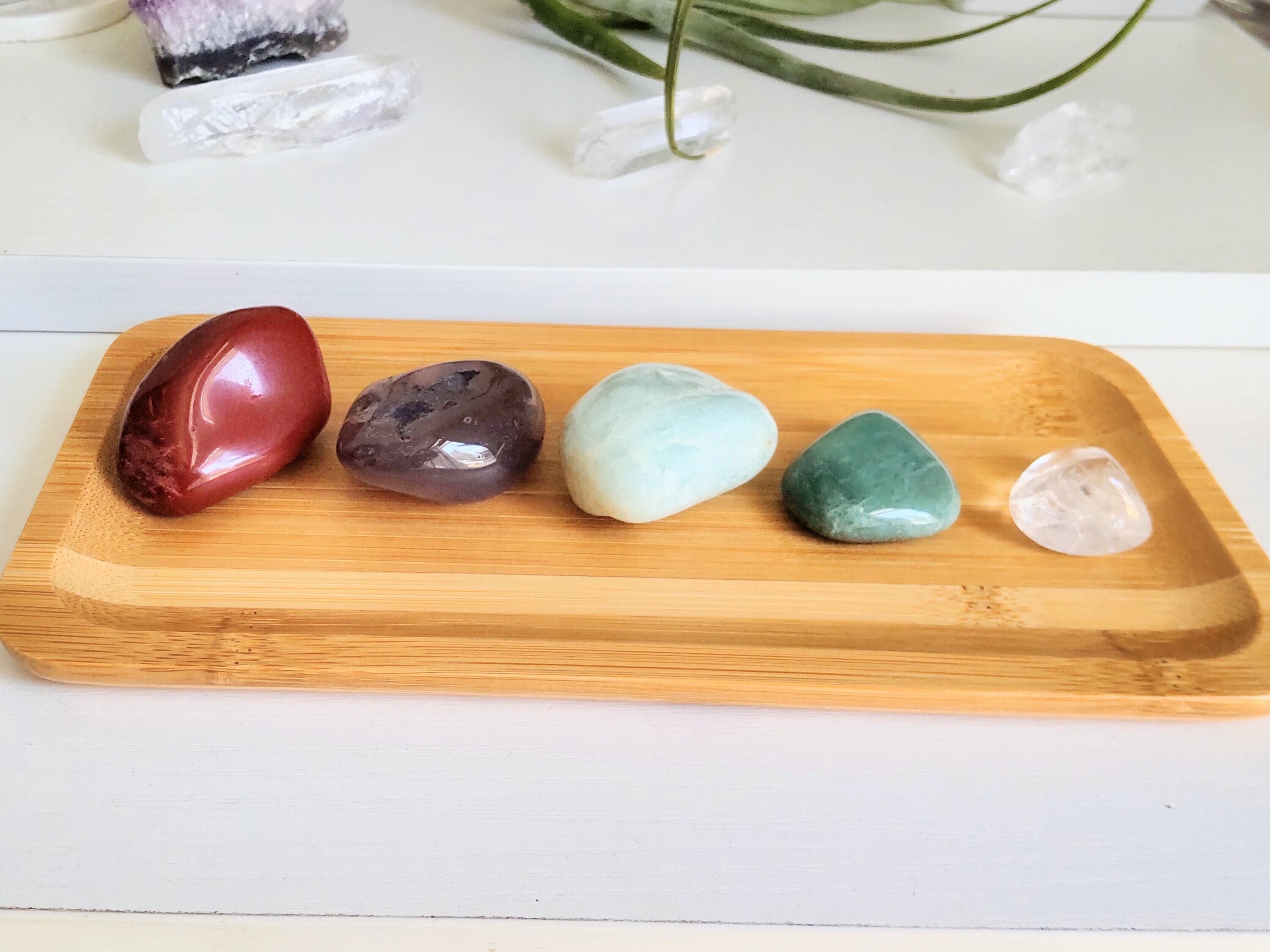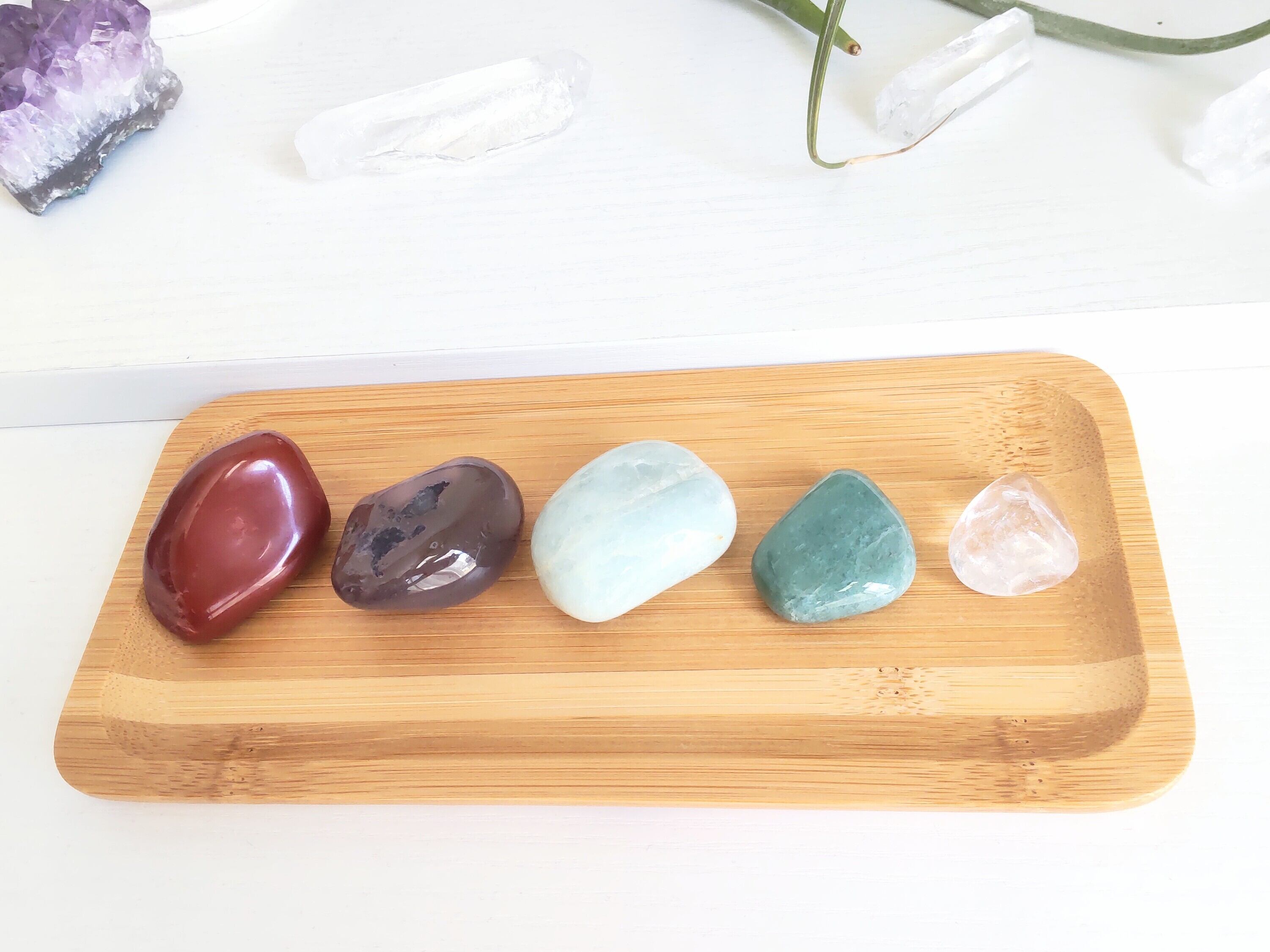 健康·幸運·癒し·安定·運気アップの5つの天然石と、浄化用さざれ、バンブートレーのセットです♪