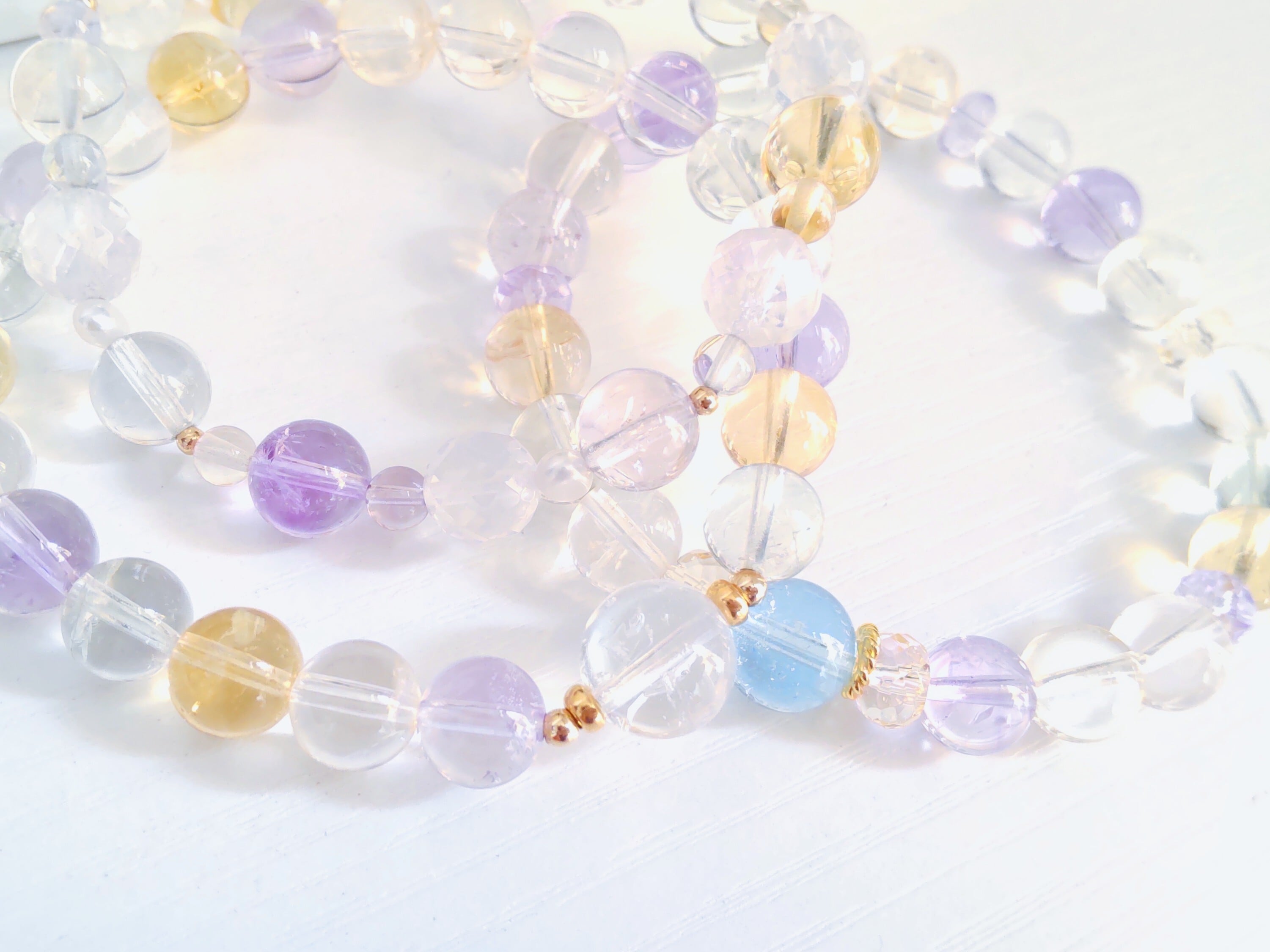 メインに、気泡入りのヒマラヤエレスチャルを使い、淡い色合いがキレイなMIX水晶で仕上げました☆